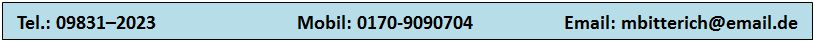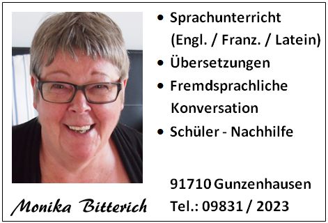 Mein Name ist Monika Bitterich und ich stehe Ihnen in Gunzenhausen und Umgebung für eine qualifizierte und effiziente Nachhilfe gerne zur Verfügung. Ich bin seit vielen Jahren selbständig und habe umfangreiche Erfahrungen im Bereich des Sprachenunterrichts für Einzelpersonen und Gruppen sowie in der Betreuung von Schülern/innen bei schulischen Defiziten in verschiedenen Fächern.Ich kann Ihnen versichern, dass durch gezieltes Eingehen auf jede/n Einzelne/n eine individuelle Betreuung mit gezielten Maßnahmen sicher gestellt ist. Viele zufriedene Eltern bestätigen meinen Erfolg. Darüber hinaus habe ich im Bereich der Erwachsenenbildung neun Jahre Sprachkurse an der VHS Gunzenhausen in Englisch und Französisch gegeben. Weiterhin habe ich Sprachtraining für Mitarbeiter in verschiedenen Firmen in Gunzenhausen und Umgebung erteilt. Ich hoffe, dass Sie hier durch den kurzen Überblick über meine Möglichkeiten auch für Sie die richtige Lösung gefunden haben. Sollten Sie hier trotzdem noch Fragen haben sprechen Sie mich bitte an. Wir finden auch für Sie eine passende und maßgeschneiderte Lösung. Vielen Dank für Ihr Interesse an meiner Webseite. |